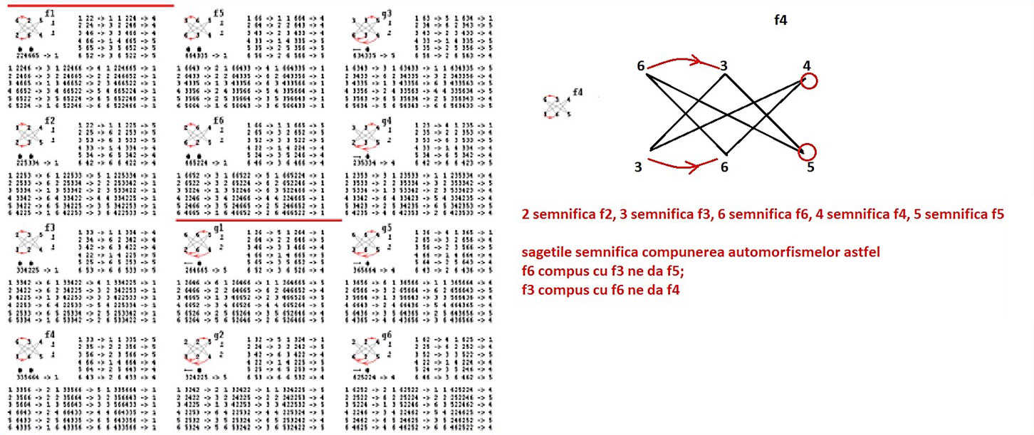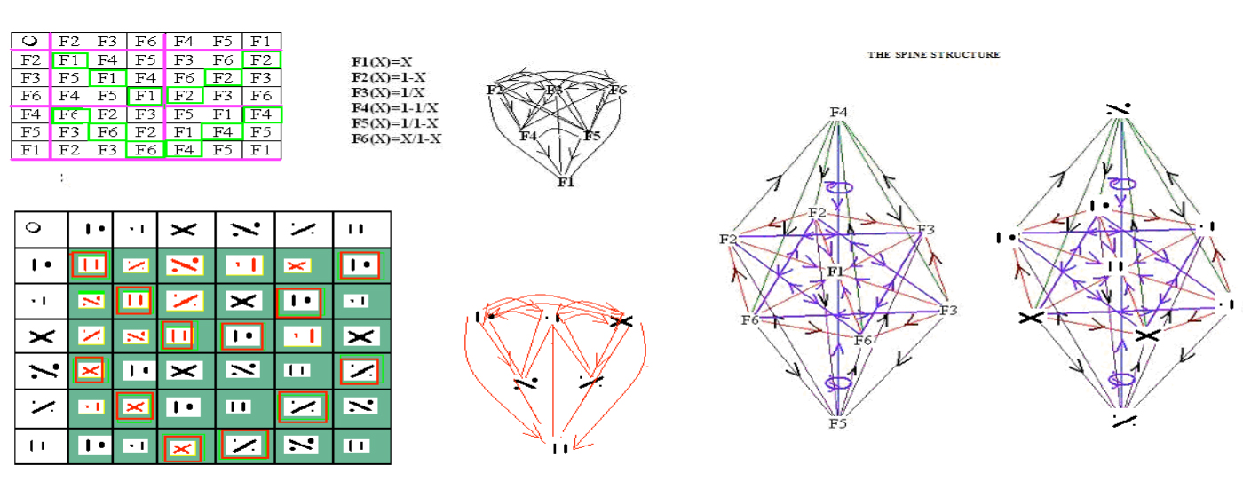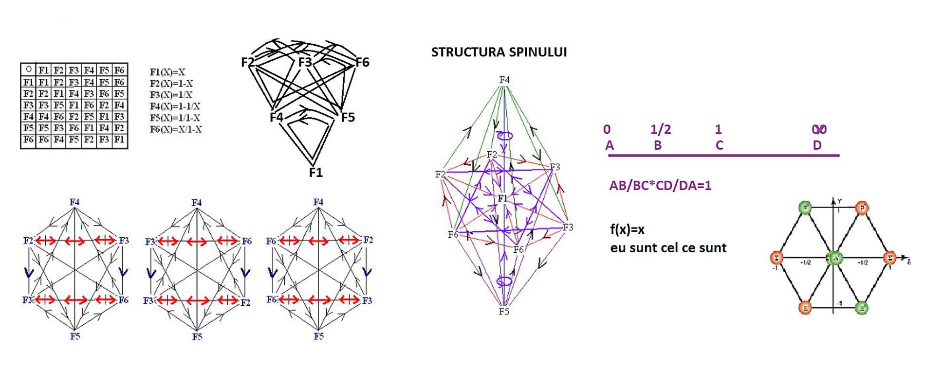 Structurile obținute iniţial sunt automorfismele dreptei proiective. Tabelele de compunere ale acestora generează la rândul lor clase de automorfisme (F2, F3, F4); (F4, F5) si (F1), care se compun in mod specific, generând cicluri si diagrame comutative (spinul).Modelele de compunere ale automorfismelor dreptei proiective