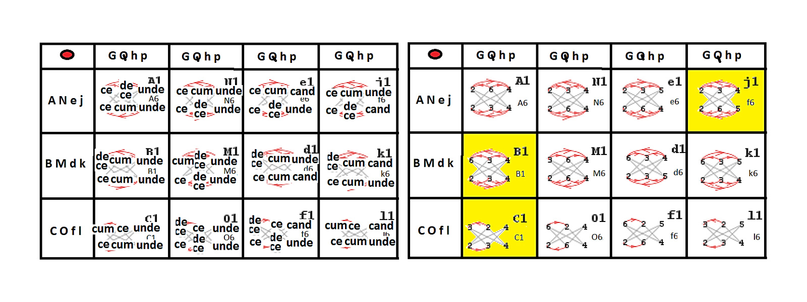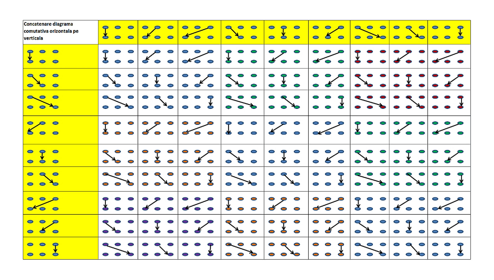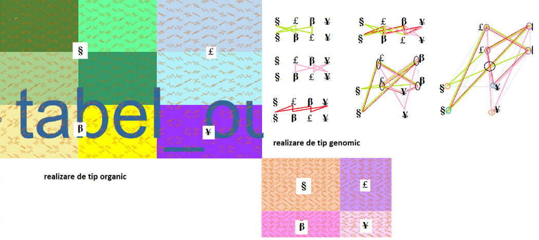 Tabelul de mai jos - TABELUL CÂMPURILOR COLORATE arată modul de generare prin compunere și modul de interferare a pachetelor de litere. Liniile de pe semnele de identificare marchează elemente care au același conținut. Tabelul de mai sus, arată relațiile complexe obținute intre generatorii ce sunt asociați unor diagrame unicursale. Modul de reprezentare simplificat prin doua linii paralele, fiecare cu cate trei puncte, pentru o diagramă unicursală se va vedea mai târziu ca nu este unic, existând două alternative.