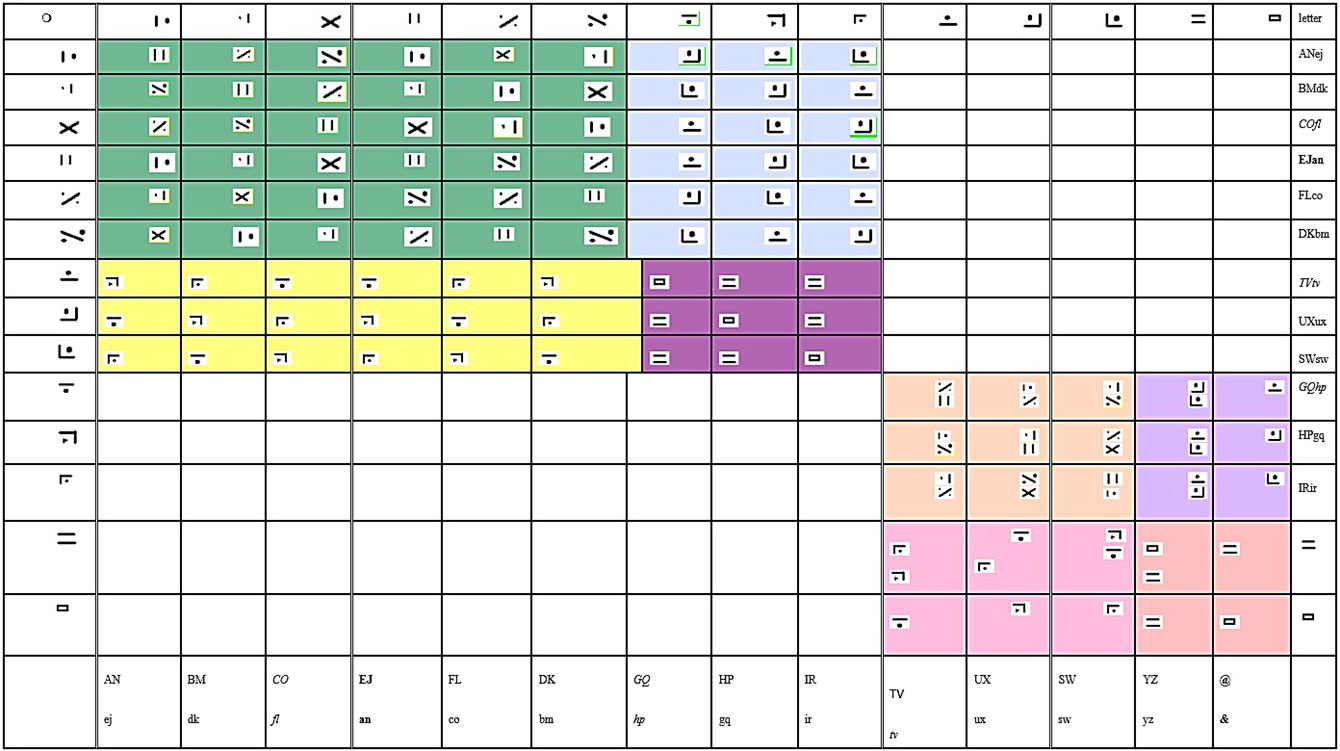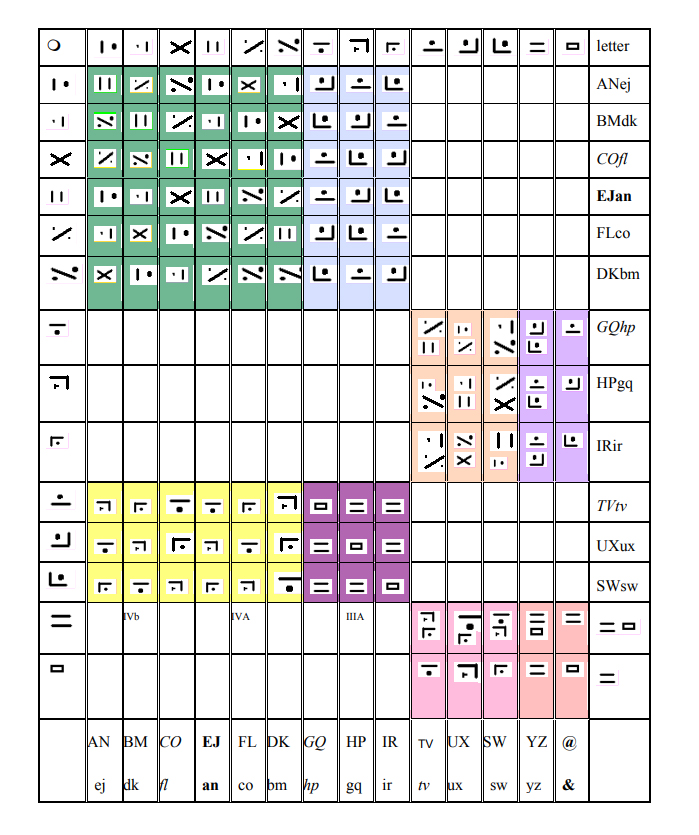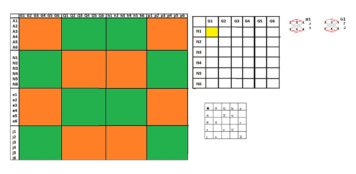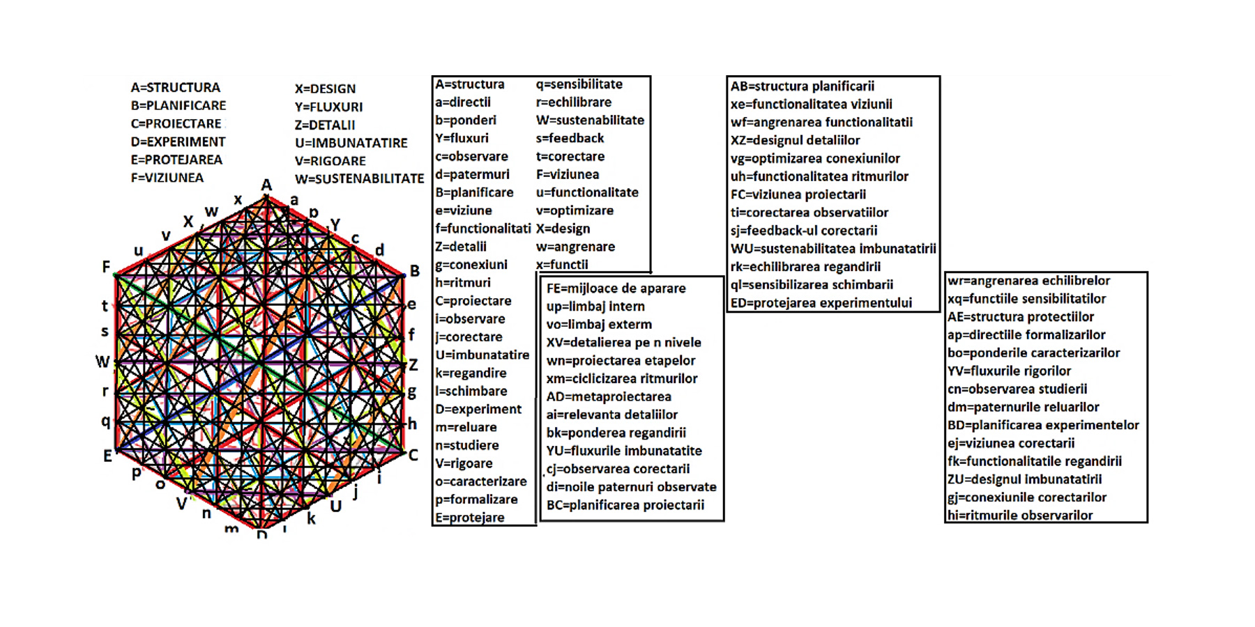 Tabelul de mai jos - TABELUL CÂMPURILOR COLORATE arată modul de generare prin compunere și modul de interferare a pachetelor de litere. Liniile de pe semnele de identificare marchează elemente care au același conținut. Tabelul de mai sus, arată relațiile complexe obținute intre generatorii ce sunt asociați unor diagrame unicursale. Modul de reprezentare simplificat prin doua linii paralele, fiecare cu cate trei puncte, pentru o diagramă unicursală se va vedea mai târziu ca nu este unic, existând două alternative.