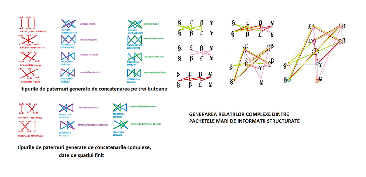 In pasul următor se generează FEEDBACK-URILE SIMPLE, notate cu litere numerotate de la 1 la 6. [ Vezi Feedback-urile simple » ]Acestea permit realizarea primelor pachete informaționale mari, generatoare ale modelului de concatenare pe trei butoane.