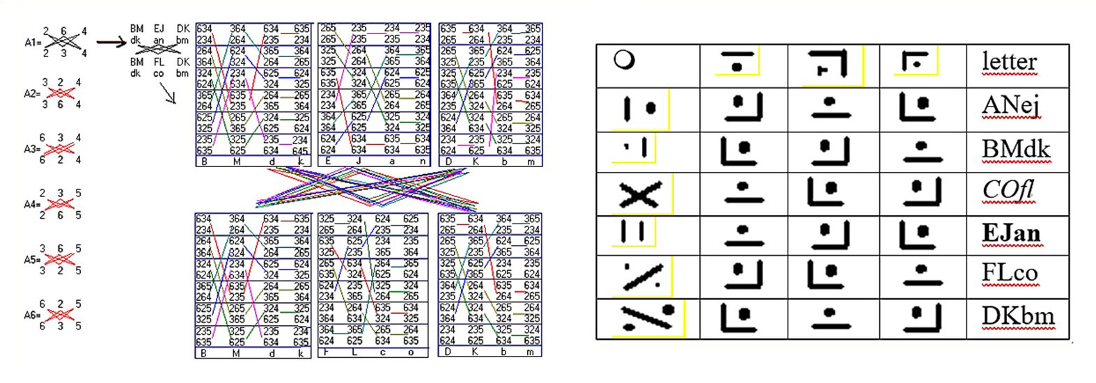 Prin asociere intre pozitii fixe ale adreselor punctelor și semnificațiile funcționale ale diagramelor unicursale se obțin pachetele de sublitere ce generează litere, vezi anexele „spinul” (@) Figura. 6 bis.